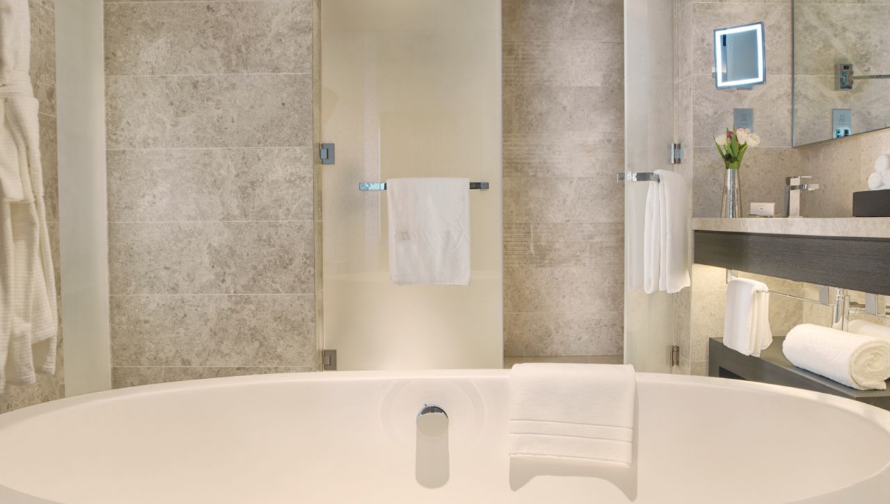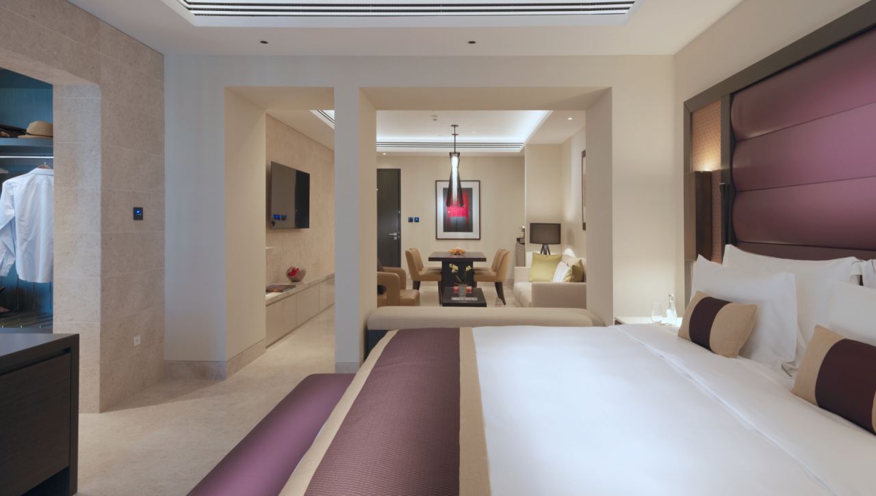 Pokoje a suity jsou navrženy tak, aby hosty obklopily světlými tóny, přírodními materiály a elegantní jednoduchostí. Velká panoramatická okna otevírají výhledy na moře, zahrady nebo přístav Al Mouj Marina. Interiéry jsou moderní, měkké v detailech a zároveň prostorné – s luxusními koupelnami, jemnými textiliemi a dekoracemi odkazujícími na ománské řemeslo. Prémiové suity a Club pokoje poskytují další úroveň pohodlí díky privátním lounge službám, osobnímu přístupu a exkluzivním výhodám. Nejvyšší kategorií jsou pak rozsáhlé rezidence a suity s velkými terasami, odkud je západ slunce nad mořem nezapomenutelný zážitek.