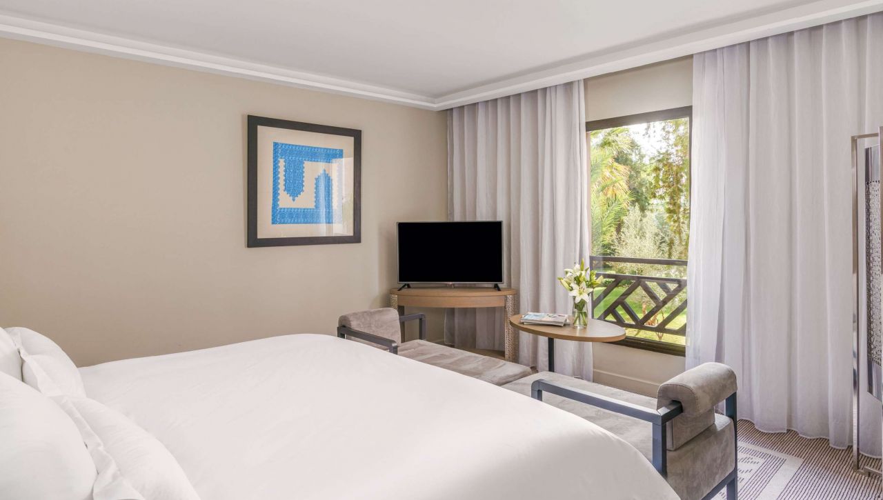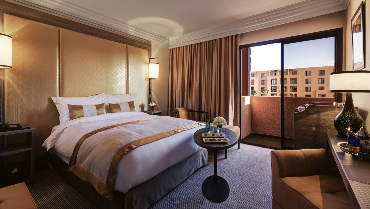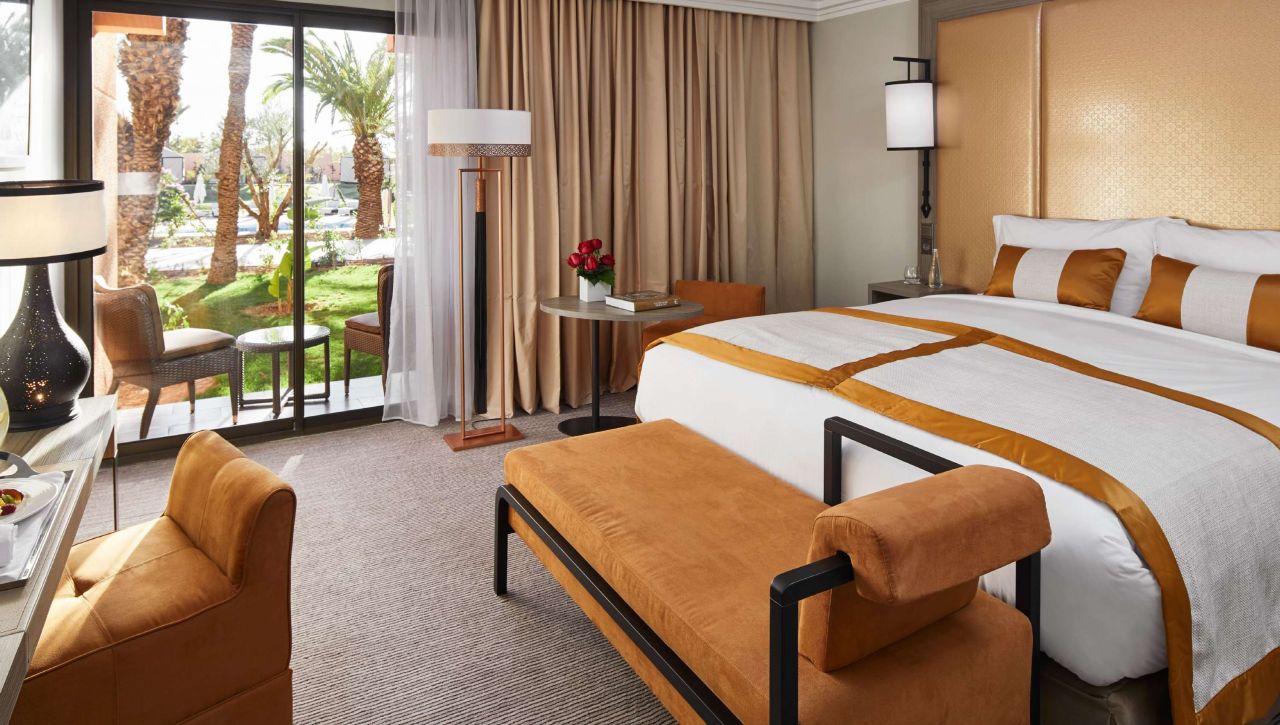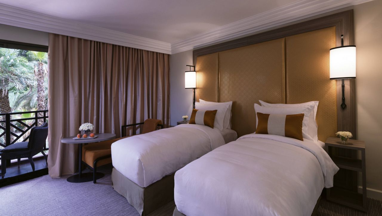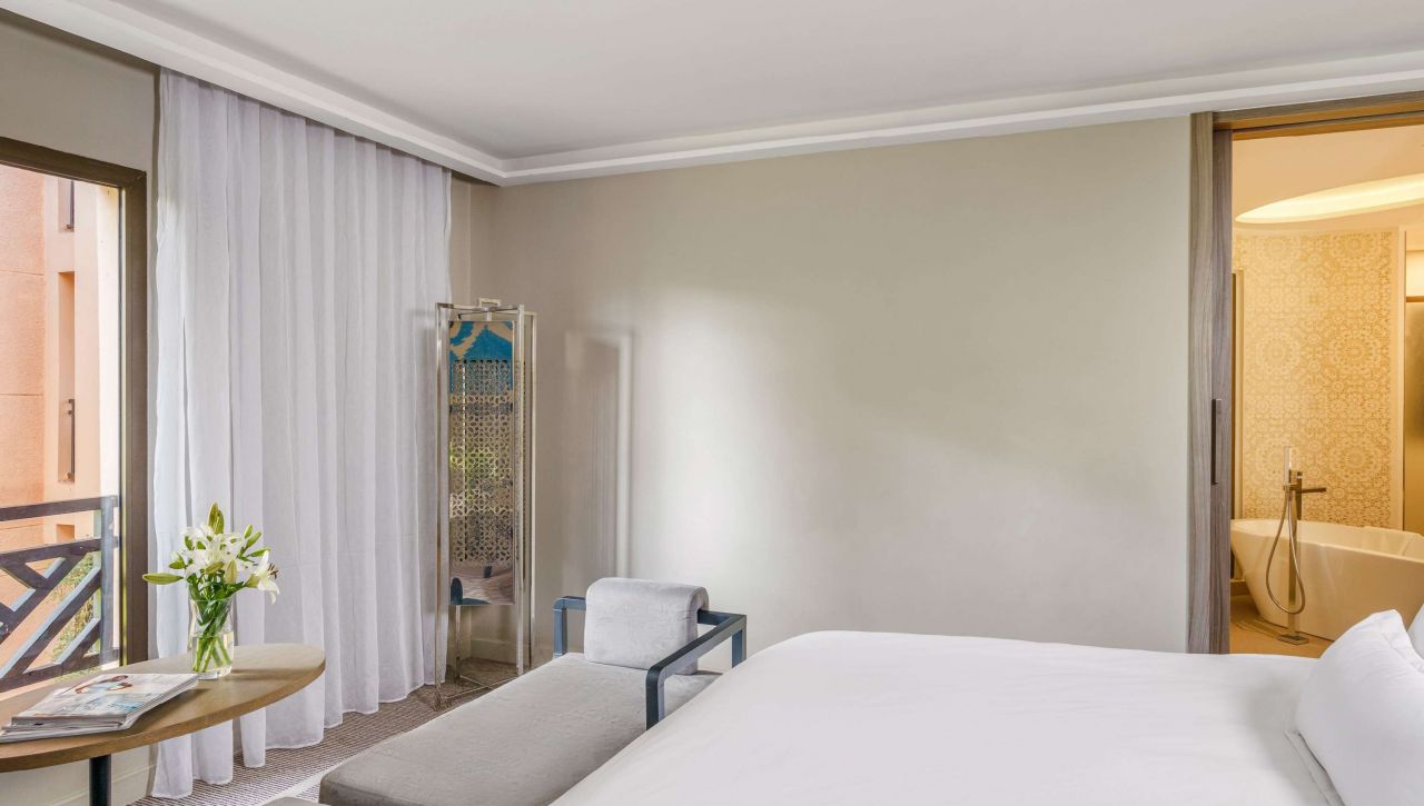 Prostorné pokoje a apartmá nabízejí nadstandardní pohodlí – velké postele s luxusním ložním prádlem, elegantní koupelny s mramorovými detaily, privátní balkony s výhledem na zahrady, bazény nebo pohoří Atlas. Každý pokoj je oázou klidu, vybaven moderní technologií a doplněn o jemné detaily, které odrážejí autentický marocký půvab.